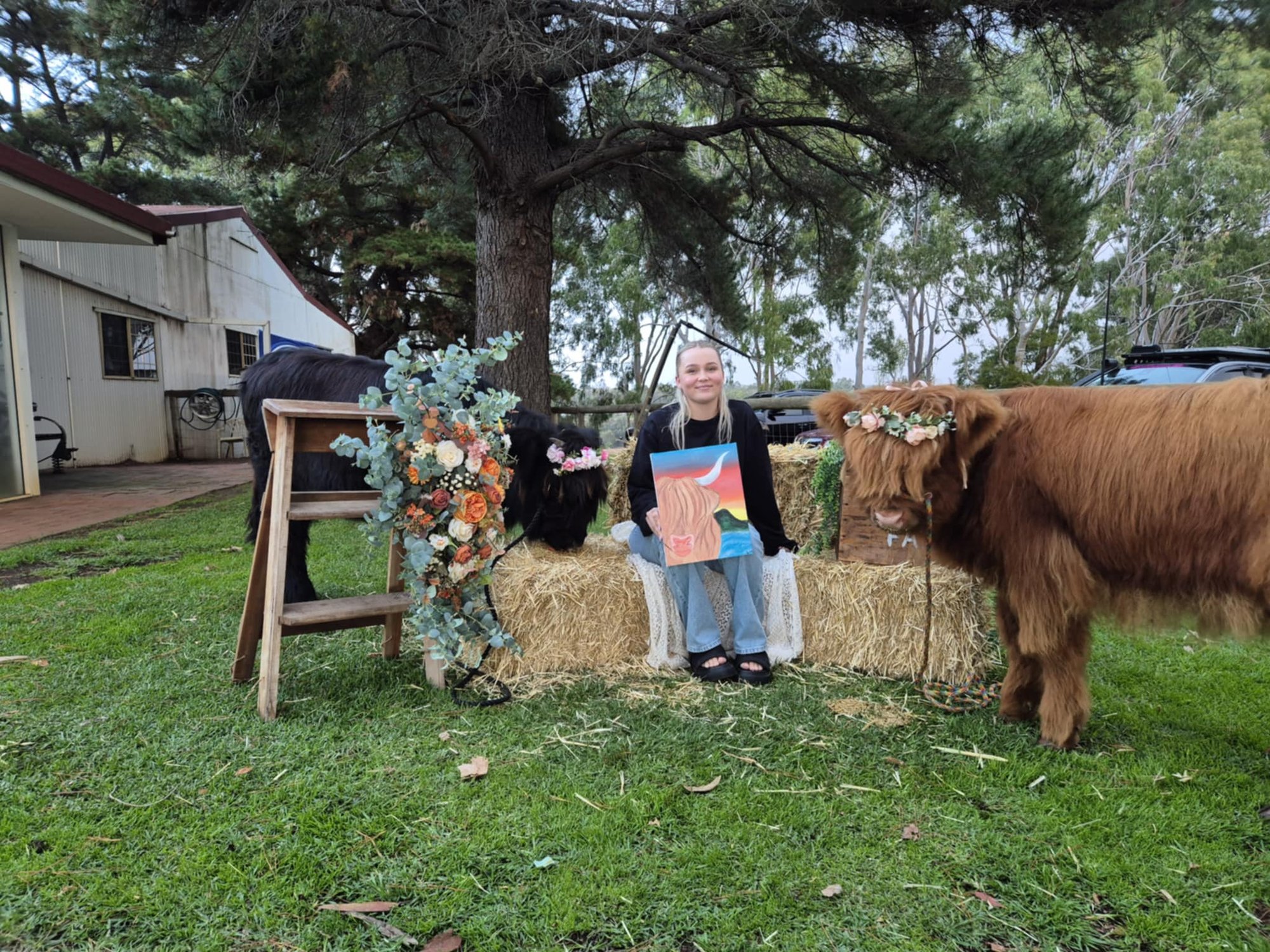 Pack your favourite bottle of vino, grab a few friends and head to Bailup Farm for an afternoon you will never forget. Set amongst our white gums and vineyard this tranquil setting is the perfect backdrop for you to let your imagination run wild while you create your master piece. Get up close and personal with our Highland Cows the very subject you will be painting.